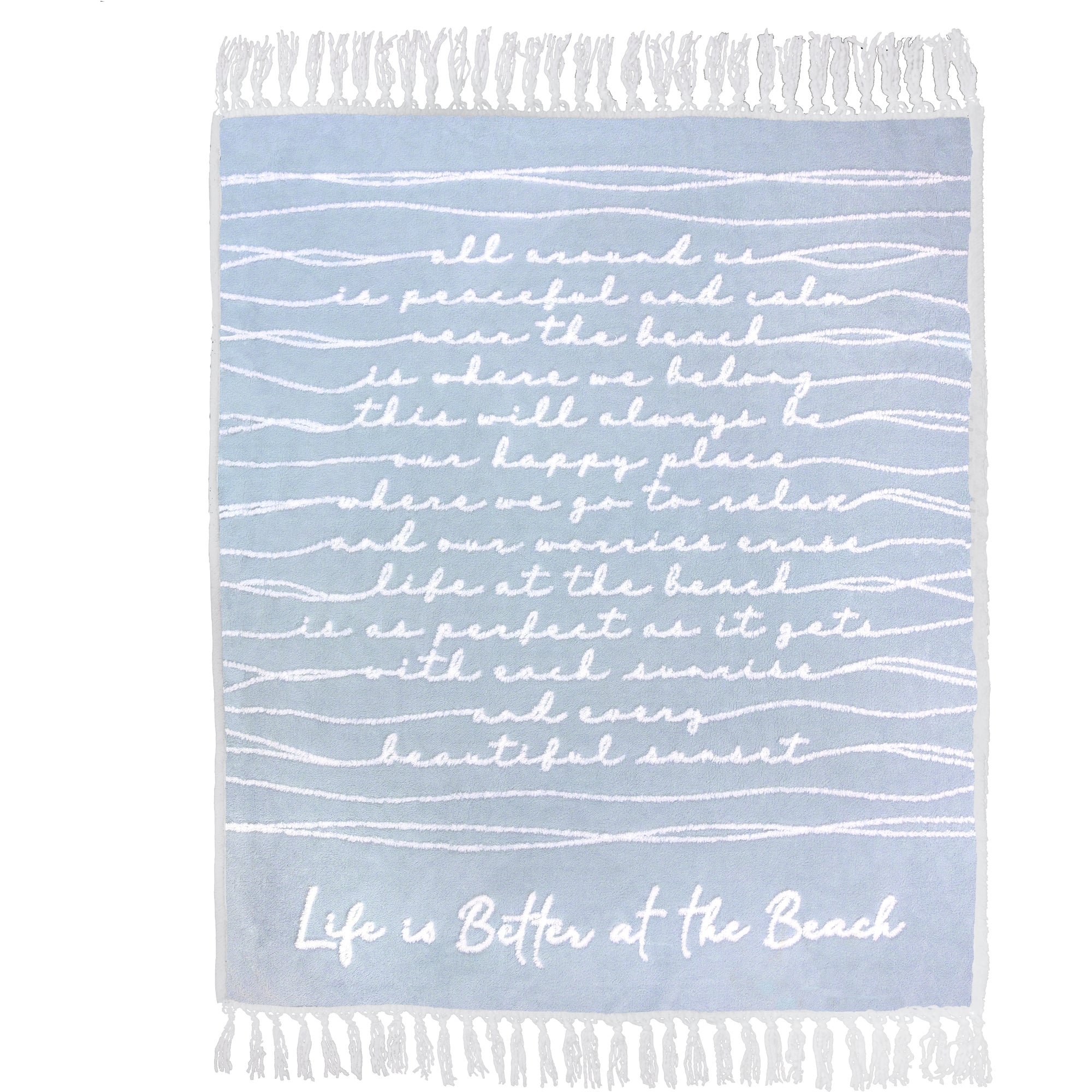 • IN-HOUSE DESIGN: Risen cursive sherpa "All Around Us Is Peaceful And Calm, Near The Beach Is Where We Belong. This Will Always Be Our Happy Place, Where We Go To Relax And Our Worries Erase. Life At The Beach Is As Perfect As It Gets, With Each Sunrise And Every Beautiful Sunset. Life Is Better At The Beach" sentiment is conveyed by wave-line thread lines connecting the ends of the words to the edge of the blanket on a beautiful soft light blue background.