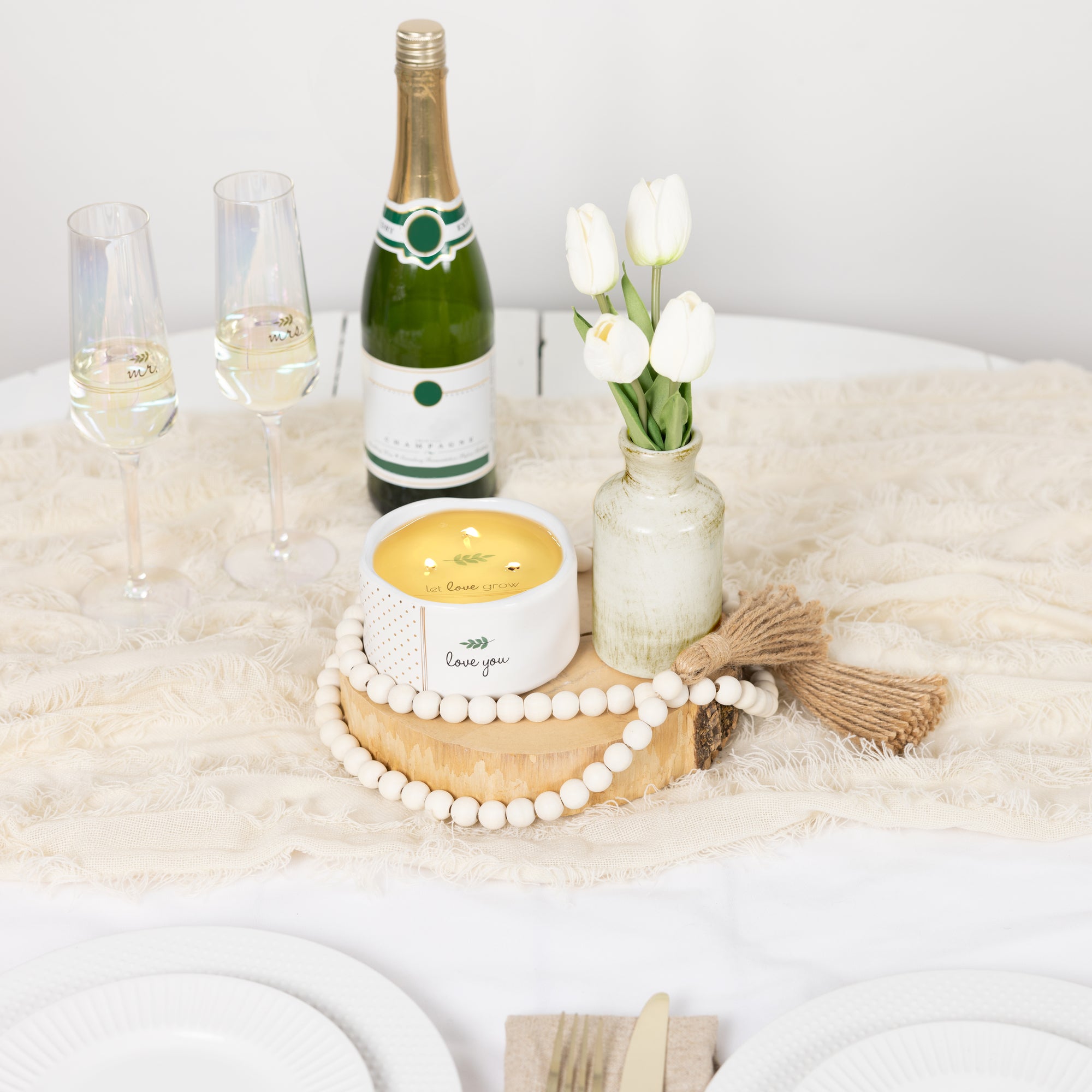 - IN-HOUSE DESIGN: The new & innovative candle offers a unique message for your loved one within the wax as time progresses. You will see cursive written "Let Love Grow" sentiment after about 10 minutes. As you watch, the entire decal with an intertwining golden triple-string and leaf design will appear after 60 minutes. Then, the message will hide again and reappear with each burn. The front of the candles has a simplistic "Love You" decal accompanied by leaf and metallic gold polka dot wrap-around patterns on a matte white exterior handmade feel vessel with a glossy interior.