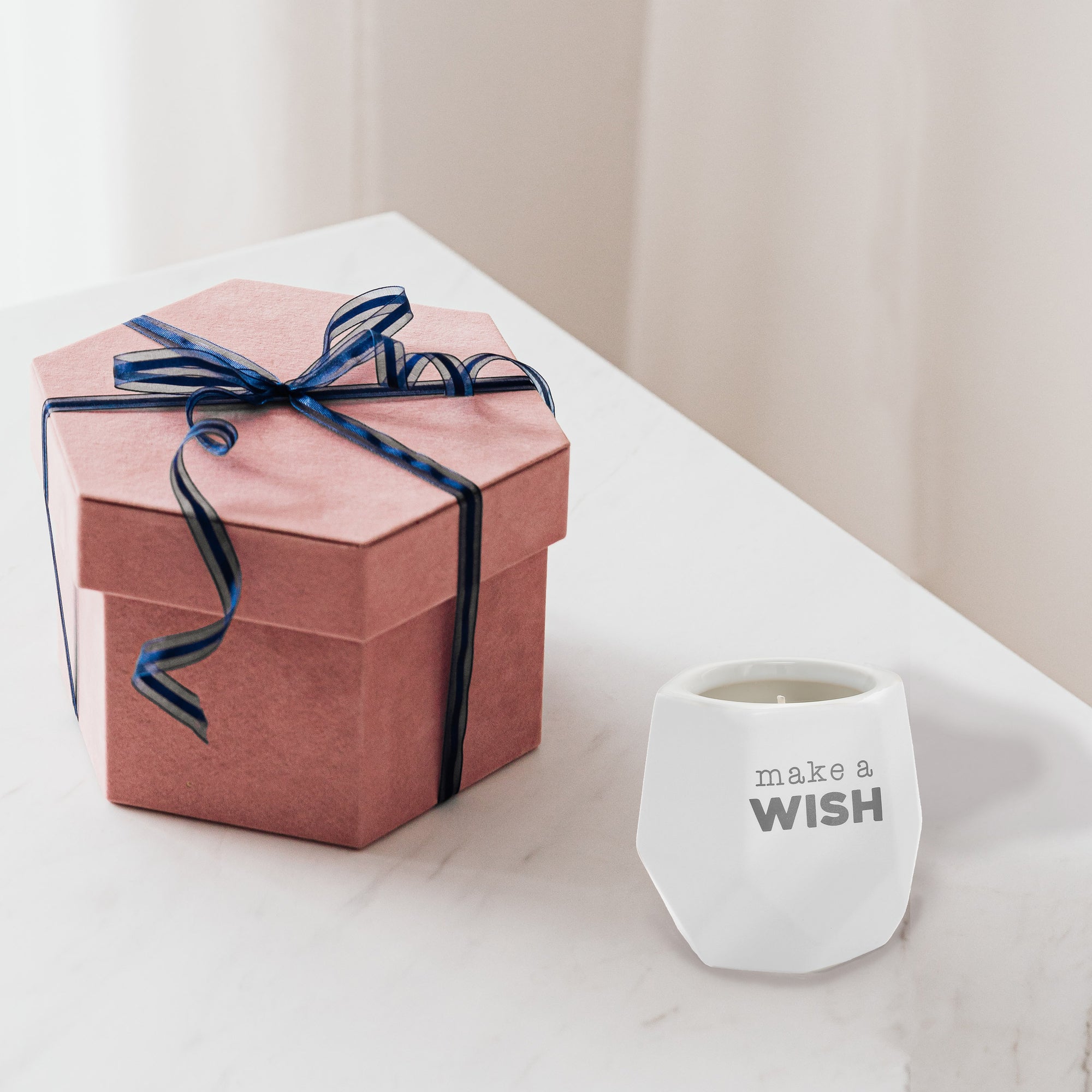 • IN-HOUSE DESIGN: Silver metallic & glossy gray "Make A Wish" sentiment lines the front center of the geometric candle, which has a six-sided hexagon on the upper two-thirds and a twelve-sided one-third bottom. Always remember to trim your wick down after each burn and burn your candle to the outside for continual even burn.