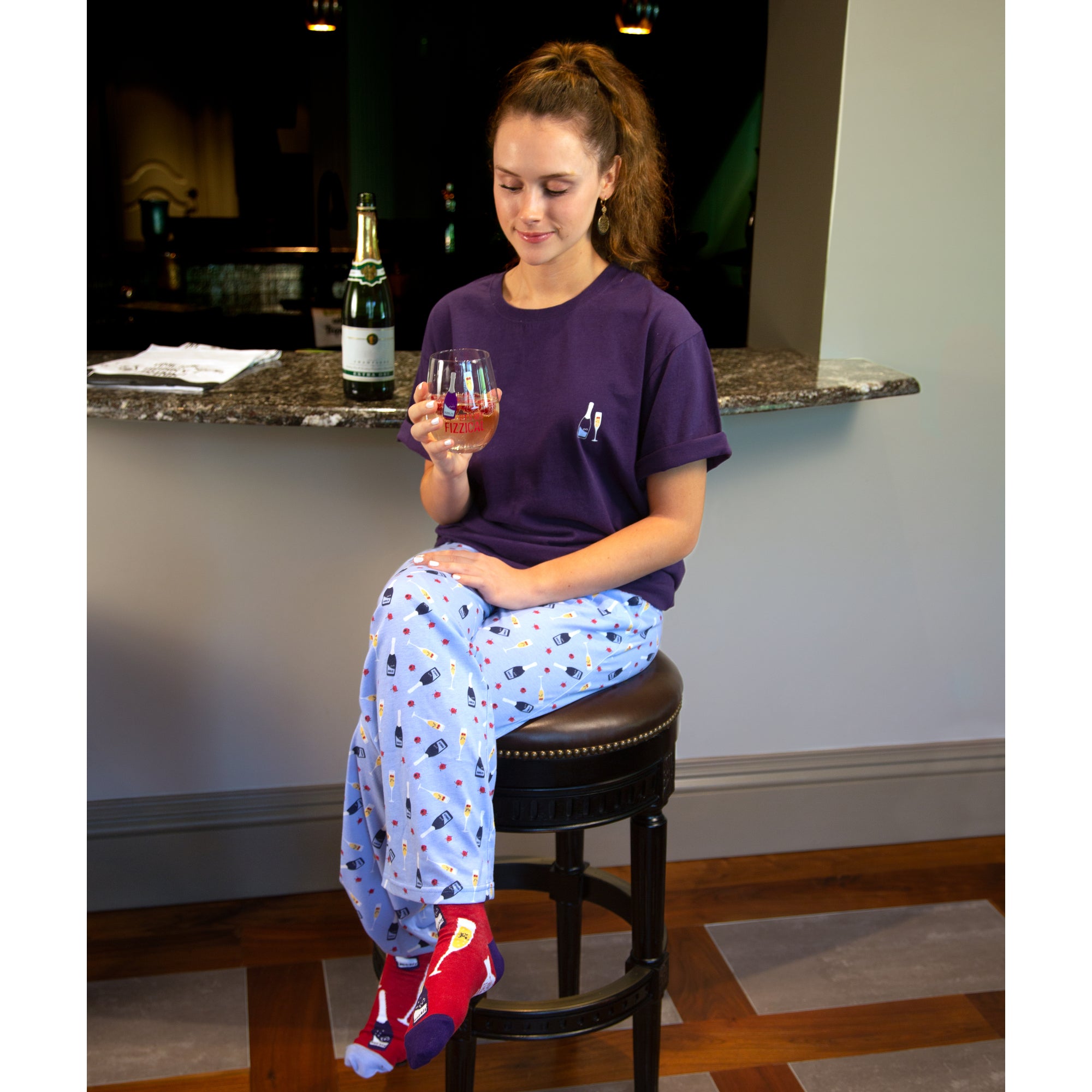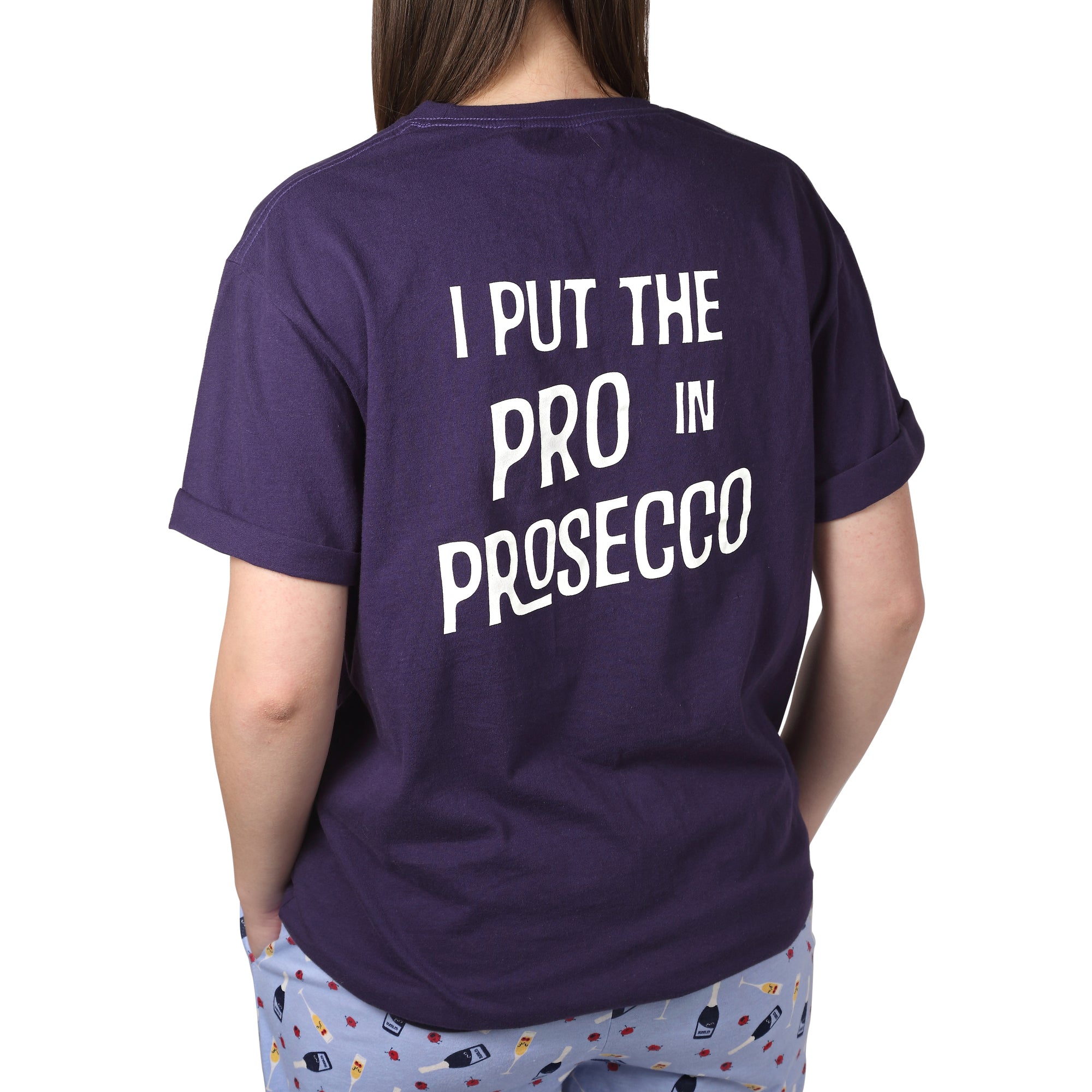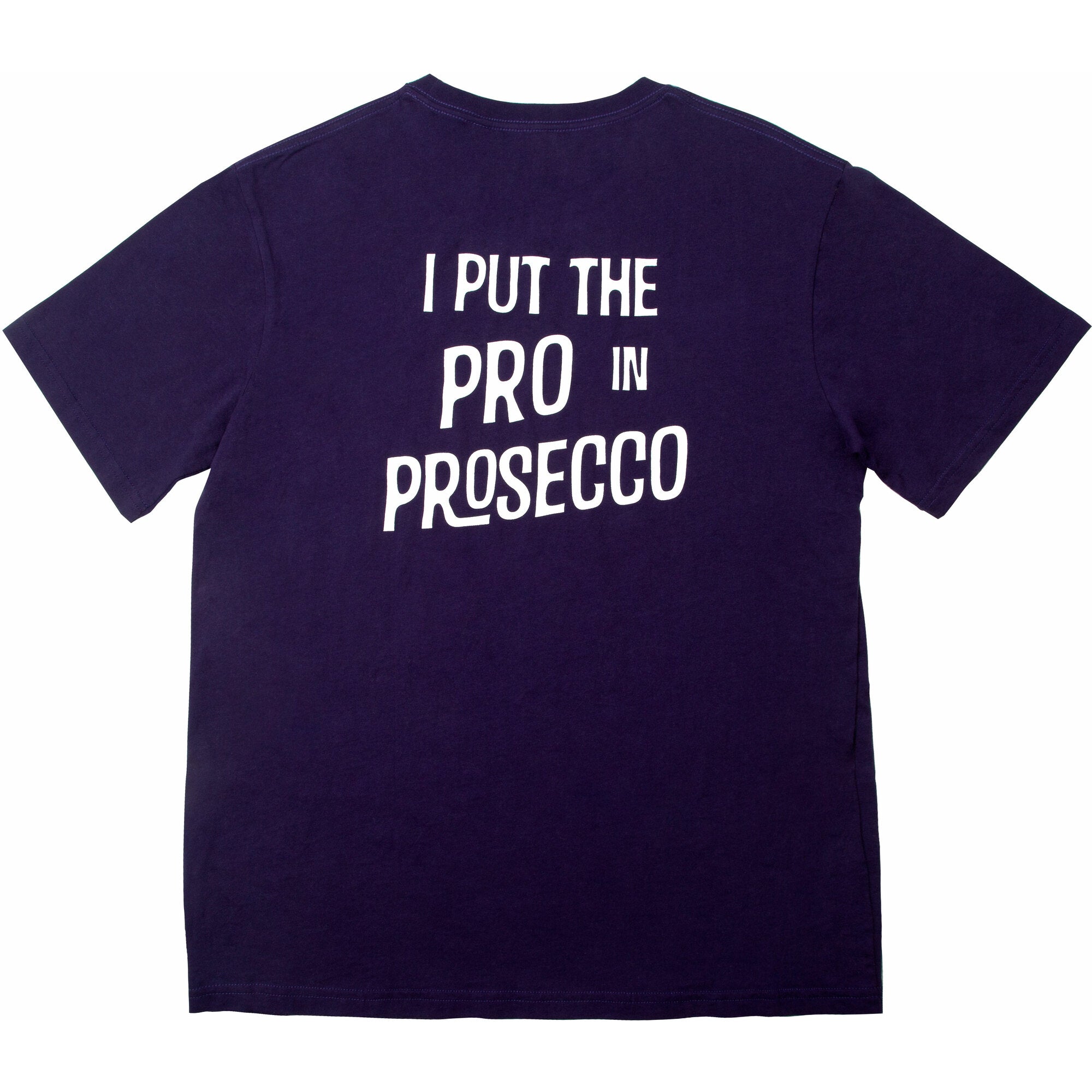 - IN-HOUSE DESIGN: "I Put The Pro In Prosecco" text is printed on the back of the t-shirt, alongside Prosecco and glass icons, which are printed on the front.