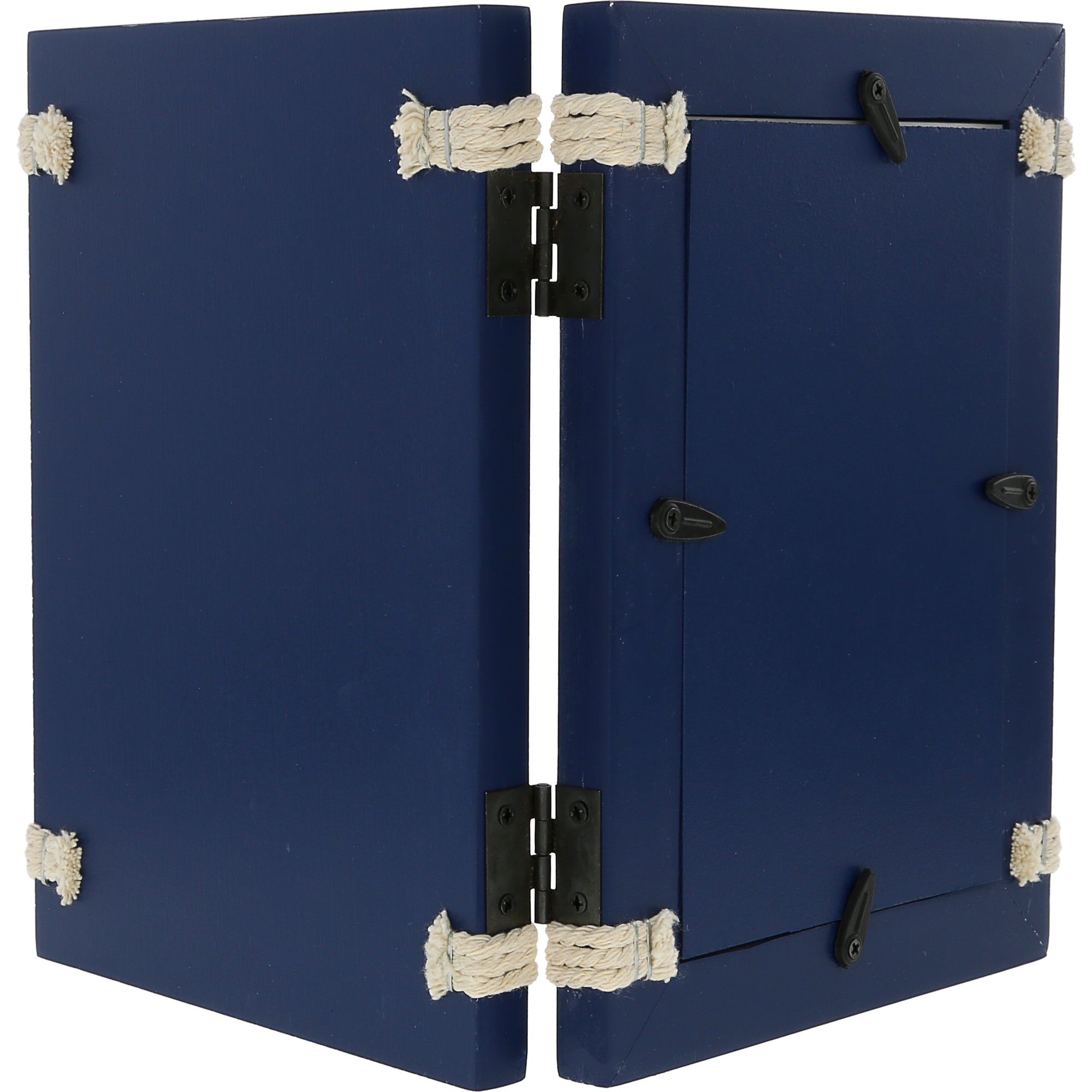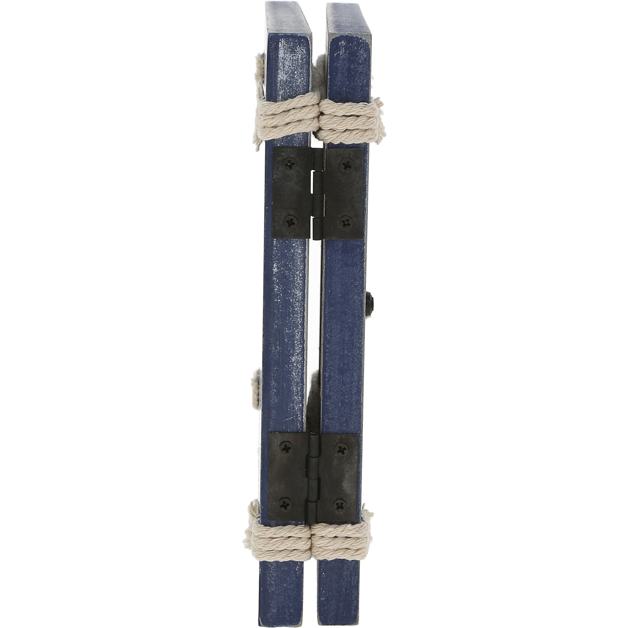 - PREMIUM QUALITY: 5.5" long (per each side - total 11.25") x 7.5" tall x 0.5" wide self-standing black metal hinged picture frame plaque constructed from MDF has a glass photo holder opening with light tan jute rope, consisting of a triple intertwined design above and below the picture opening, stapled onto the back of the frame. The backside features four turn tabs to remove the backing to place your favorite memories easily inside. The neutral navy blue & white weathered finish fits a rustic or modern style.