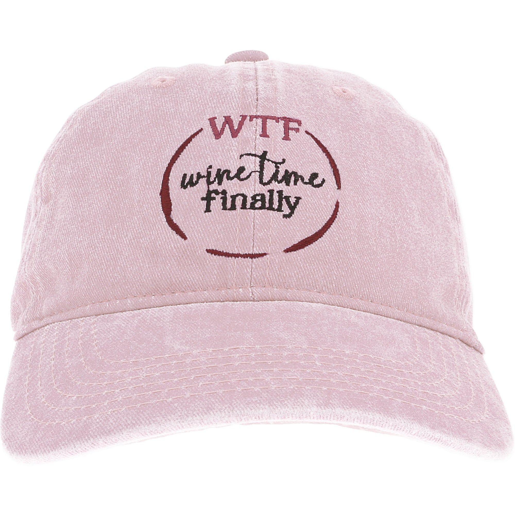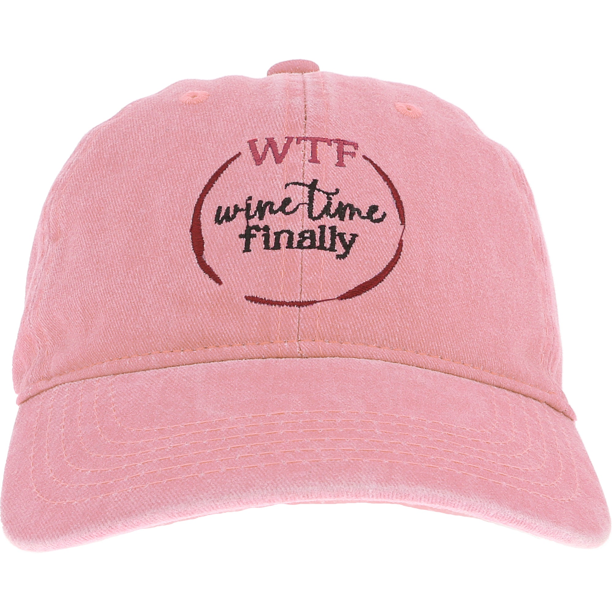 • IN-HOUSE DESIGN: The distress pink hat has a red wine spill outline with "WTF Wine Time Finally" black and pink sentiment that are both embroidered. The side of the hat also features an embroidered glass of red wine.