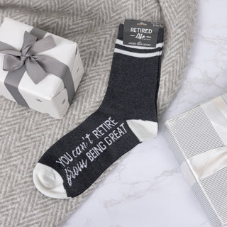 - IN-HOUSE DESIGN: The crew socks have a white ankle, toe & heel with a gray body and a white "You Can't Retire From Being Great" sentiment on the outer lateral of the boot socks. The top of the crew socks have two stripes.